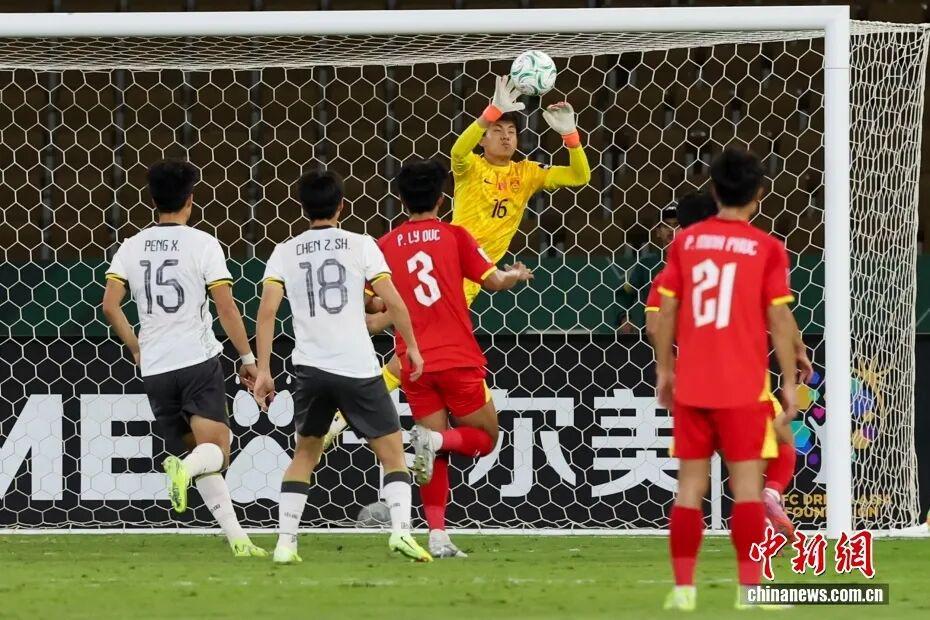 ▲北京时间1月21日凌晨,在沙特阿拉伯举行的2026亚足联U23男足亚洲杯半决赛中,中国队3∶0击败越南队。图为中国队门将李昊在比赛中扑救。图/视觉中国