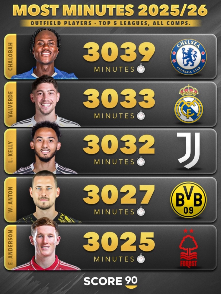 奇异果官网-本赛季五大联赛非门将球员出场时间榜:范戴克3510分钟第三